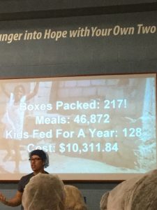 Volunteering at Feed My Starving Children also proved to be a valuable exercise in teamwork. Groups of 5-10 volunteers “hand-packed rice, soy, dried vegetables and a nutritionally complete blend of vitamins and minerals into bags which are then sealed, boxed, placed on pallets and shipped.” The students had to be organized in the packing process, working together to pack all of the meals possible in our limited time. Great job to everyone who participated and thanks for making that a night to remember!