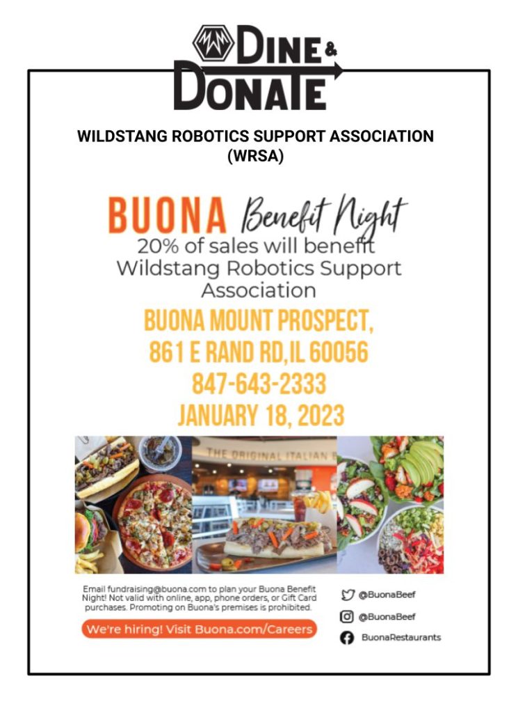 Buona will donate 20% of all dine in and drive through orders to the WildStang Robotics Program.