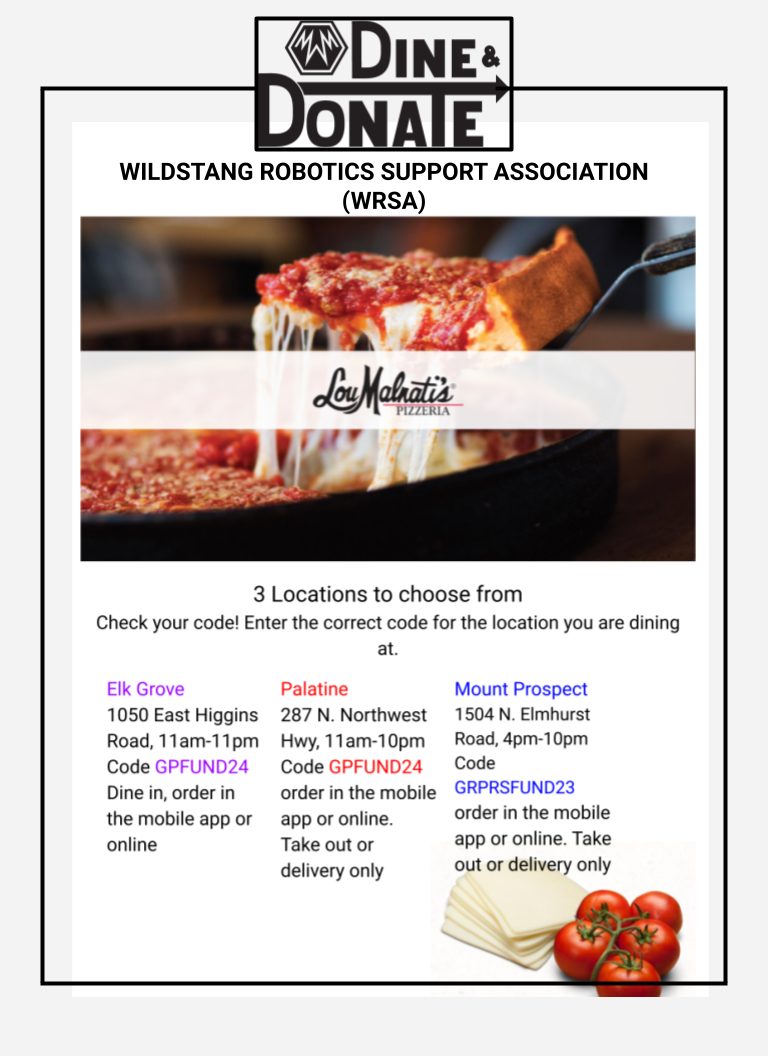 Elk Grove – 1050 East Higgins Road, 11am-11pm Dine in, order in the mobile app, or online at ttps://www.loumalnatis.com/elk-grove-village and use code GPFUND24, show the flyer for Dine in.