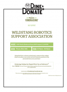 • WildStang Robotics Program Open House – Presentation to parents, sponsors, D214, and media revealing the year’s robot. Water and light snacks. Usually the third Sunday in February.
