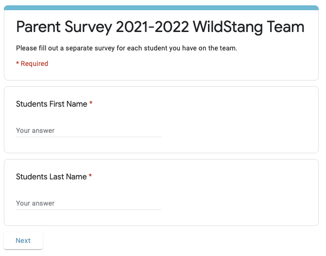Please complete the survey for this year’s team, including your contact info, student T-Shirt information and volunteering. You will need to know your students ID # and shirt size.