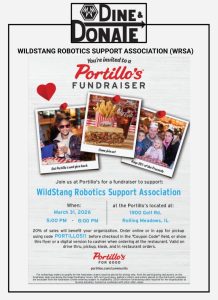 • WildStang Robotics Program Open House – Presentation to parents, sponsors, D214, and media revealing the year’s robot. Water and light snacks. Usually the third Sunday in February.